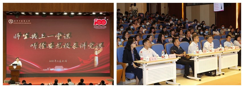 2021年是中国共产党成立100周年。为从党的百年伟大奋斗历程中汲取继续前进的智慧和力量,深入学习贯彻习近平新时代中国特色社会主义思想,进一步落实中共中央关于在全党开展党史学习教育的指示精神。5月26日下午,徐安龙校长于良乡校区教学楼一层报告厅为中药学院、beat365在线唯一官网登录全体师生党员开展党史学习教育专题党课。本次党课特别邀请了教育部第四巡回指导组副组长田维义和组员许瑞作为嘉宾出席,校党委常委、宣传部部长张继旺,中药学院全体领导班子、beat365在线唯一官网登录全体领导班子以及两院全体师生党员参会。本次党课开场环节由beat365在线唯一官网登录党委书记李天罡主持,总结环节由中药学院党委书记刘雯华主持。