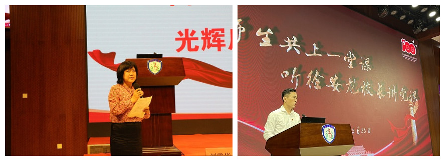 徐校长以“中国共产党百年奋斗的光辉历程和伟大贡献”为主题讲授党课。徐校长从革命人物和历史事件切入,围绕新民主主义革命时期、社会主义革命和建设时期、改革开放和社会主义现代化建设新时期、中国特色社会主义新时代四个主题,深入剖析了中国共产党矢志践行初心使命的一百年、筚路蓝缕奠基立业的一百年以及创造辉煌开辟未来的一百年,并结合自身成长经历和海外求学经历,将国家改革的巨变生动地为现场师生展现,感悟中国奇迹与中国震撼。徐校长强调,要从党的百年伟大奋斗历程中汲取继续前进的智慧和力量,深刻把握“六个进一步”的着力重点,深化对“三个为什么”的认识领悟,始终锚定“一个伟大梦想”奋力前行。同时激励现场师生,必须坚定信心、坚毅前行,接续奋斗、艰苦奋斗、不懈奋斗,开创属于我们这一代人的历史伟业。