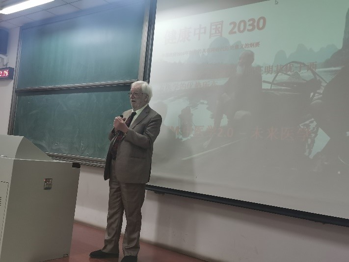 11月19日、21日晚,德国著名的宇航医学与健康工程学专家、beat365在线唯一官网登录柔性引才卡尔-海因斯·睿博教授在良乡东院教学楼153教做了题为“健康中国2030,中医学研究与教学所面对的挑战——中医学的创新之路,从TCM1.0到TCM2.0版本的未来医学”系列讲座的第一讲《健康中国2030》和第二讲《从量子物理学到意识-宇宙,精神,物质和健康》,来自各个学院的师生聆听了讲座。