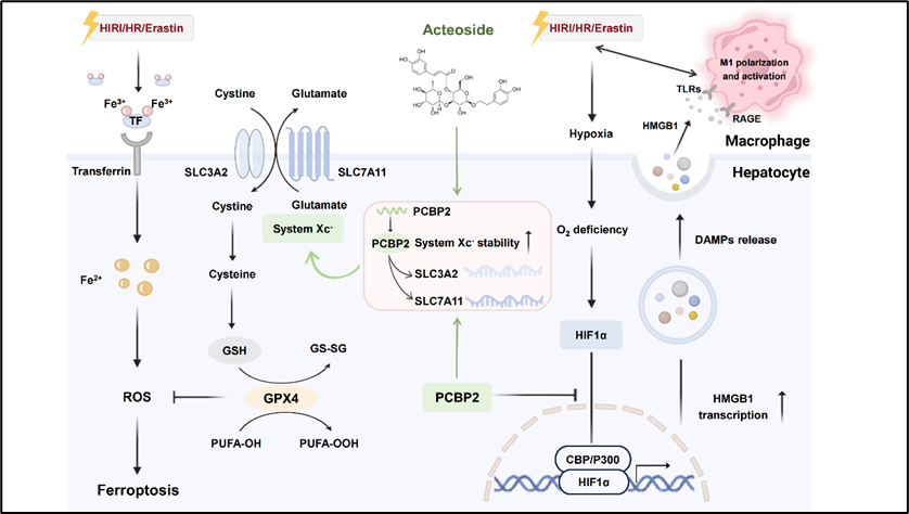 基于肝移植过程中基础性的肝脏缺血再灌注损伤(HIRI),受启于肝细胞铁死亡过程中SLC家族氨基酸跨膜家族蛋白SLC7A11和SLC3A2(构成转运系统Xc-)稳定性受损,李晓骄阳课题组发现中药熟地黄有效成分毛蕊花糖苷(ACT)可通过调节聚(rC)结合蛋白2(PCBP2)恢复SLCs跨膜转运系统的mRNA稳定性,同时干预组蛋白乙酰转移酶家族因子p300激活缺氧诱导因子HIF1α转录活性,以此降低炎性预警蛋白HMGB1的表达和分泌,进而抑制HIRI进程中肝脏微小单元的巨噬细胞募集和免疫环境恶化。此外,通过进一步构建肝细胞靶向PCBP2沉默的小鼠模型,证实了ACT对HIRI的治疗效果依赖于PCBP2维持转运系统Xc-的稳定性和限制HIF1α/P300-HMGB1改善免疫微环境来减轻HIRI进程中的肝细胞铁死亡发生。该研究首次揭示了RNA结合蛋白PCBP2对铁死亡明星转运系统Xc-双蛋白SLC7A11和SLC3A2的结合和稳定维持作用,创新性地借助多蛋白互作及分子垂钓手段证实了肝细胞铁死亡进程中的免疫微环境变化,并验证了天然中药成分ACT对肝脏缺血再灌注的治疗效果(Xiaojiaoyang Li et al., APSB, 2024)。