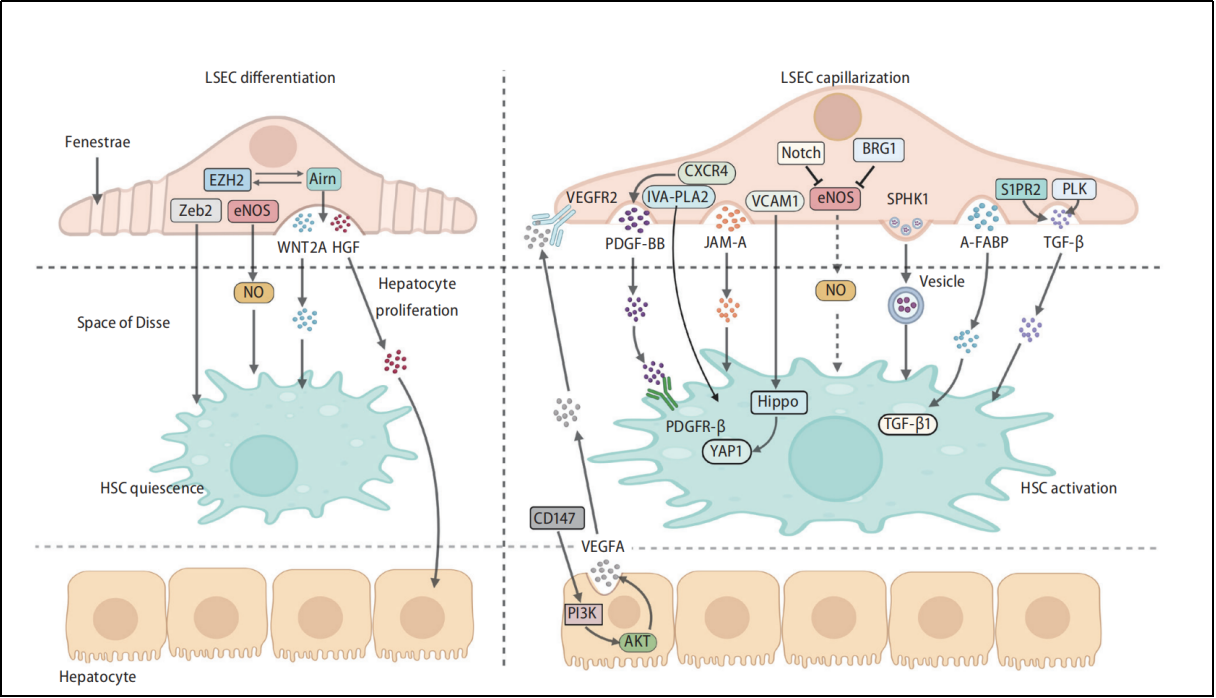 在肝缺血再灌注损伤和肝纤维化等病理过程中,LSEC作为肝脏内部血管系统的组成部分,由于其位于血液与其他肝细胞之间的交界的特殊位置,负责调节物质交换,具有重要的生理功能。我们另一项研究重点关注了LSEC在肝纤维化中的病理改变。首先总结了LSEC在肝纤维化中的去分化过程,包括毛细血管化、窗孔消失和细胞表型转变等。在慢性肝损伤中,LSEC去分化不仅改变了其自身特性,还影响了与肝内其它细胞之间的交流,推动了肝纤维化的进程。其次深入探讨了LSEC内部稳态和血管分泌信号的调节机制,并发现LSEC的物理和化学特性改变导致其与多种细胞类型之间的正常沟通受损。通过对各种包括中医药在内的抗纤维化药物干预效果和最新调控机制进行系统总结和讨论,我们的研究为LSEC在肝纤维化病理生理学中的复杂作用提供了深入见解(Xiaojiaoyang Li et al., Clin Mol Hepatol, 2024)。该研究发表后得到耶鲁大学Yasuko Iwakiri教授的高度肯定,并发表题为“Unlocking the Role of Liver Sinusoidal Endothelial Cells: Key Players in Liver Fibrosis”的社论,全面论述了LSEC的结构变化,包括窗孔和毛细血管化、一氧化氮依赖的LSEC与肝星状细胞(HSC)通讯、LSEC的清除能力以及异质性(Yasuko Iwakiri, Clin Mol Hepatol, 2024)。受Clinical And Molecular Hepatology杂志邀请,课题组再次对该社论做出题为“Correspondence on Letter regarding ‘Liver Sinusoidal Endothelial Cell: An Important Yet Often Overlooked Player in the Liver Fibrosis’”的回应,进一步探讨了寻找LSEC及其窗孔的特异性标志物对于揭示LSEC的复杂生理病理学的意义,揭示了LSEC对靶向疗法的开发具有巨大的应用前景,以及中药抑制肝纤维化病理性血管生成的潜力(Xiaojiaoyang Li et al., Clin Mol Hepatol, 2024)。