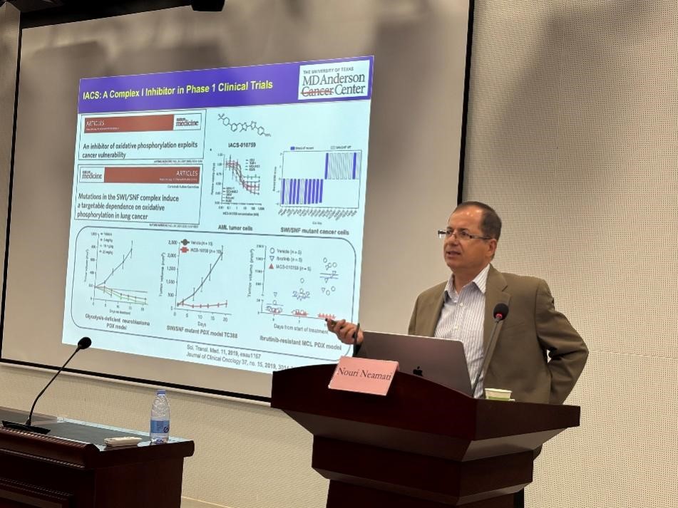 本次报告,Neamati教授系统阐释了靶向肿瘤细胞代谢缺陷这一新兴抗癌策略的科学基础与临床价值。他以团队最新研发的靶向氧化磷酸化(OXPHOS)通路抑制剂为例,全景式展示了从基础研究到新药发现的完整路径:包括NDUFS7靶点的创新发现与验证、基于结构的虚拟筛选技术应用、先导化合物的理性优化策略,以及关键成药性评价体系的建立。特别值得关注的是,其团队开发的NDUFS7小分子抑制剂在临床前研究中展现出显著的抗肿瘤活性,为代谢靶向治疗提供了新的候选药物。作为同时主导HIV和癌症新药研发的跨学科专家,Neamati教授强调了跨学科研究在创新药物设计中的关键作用。