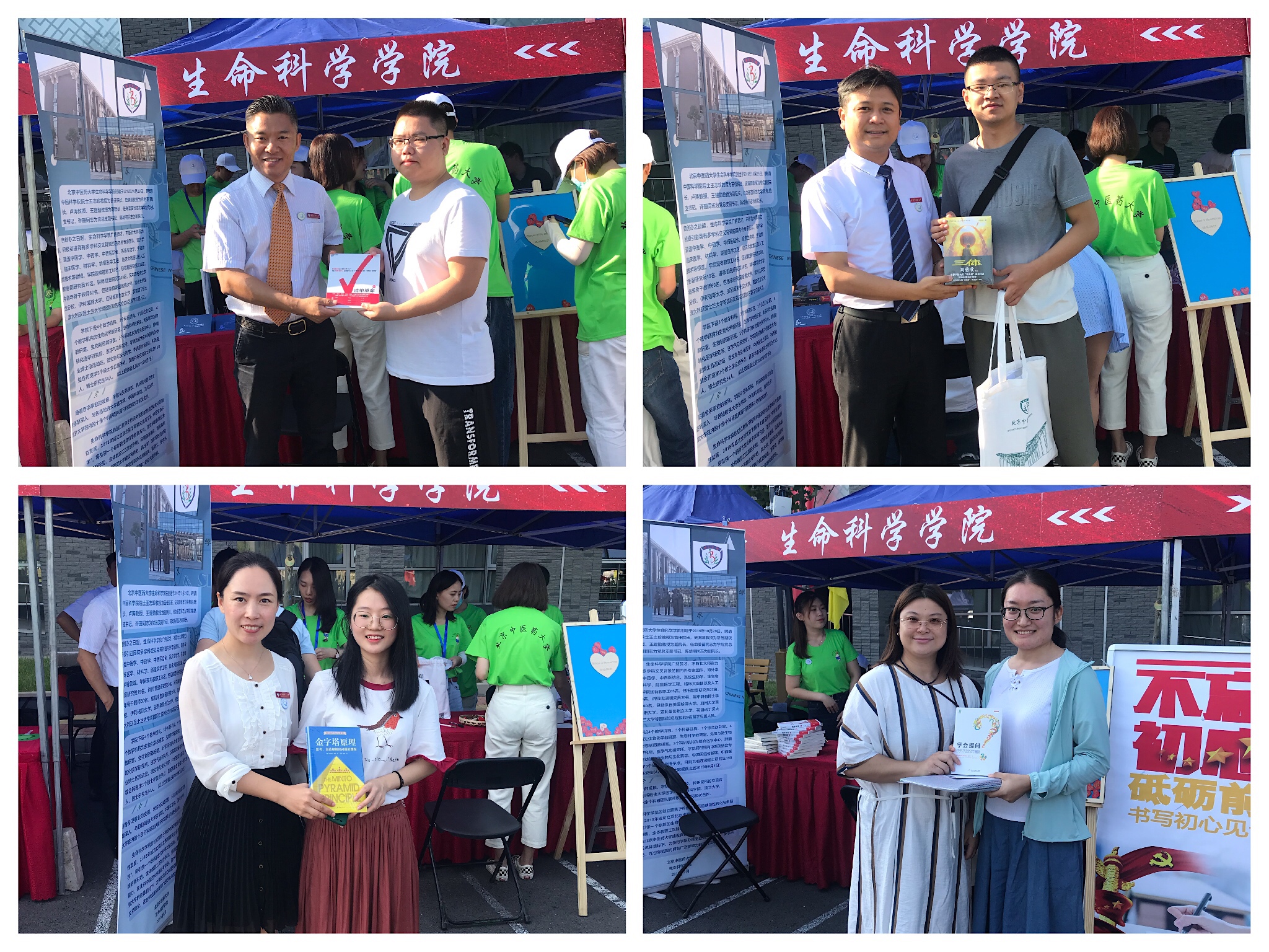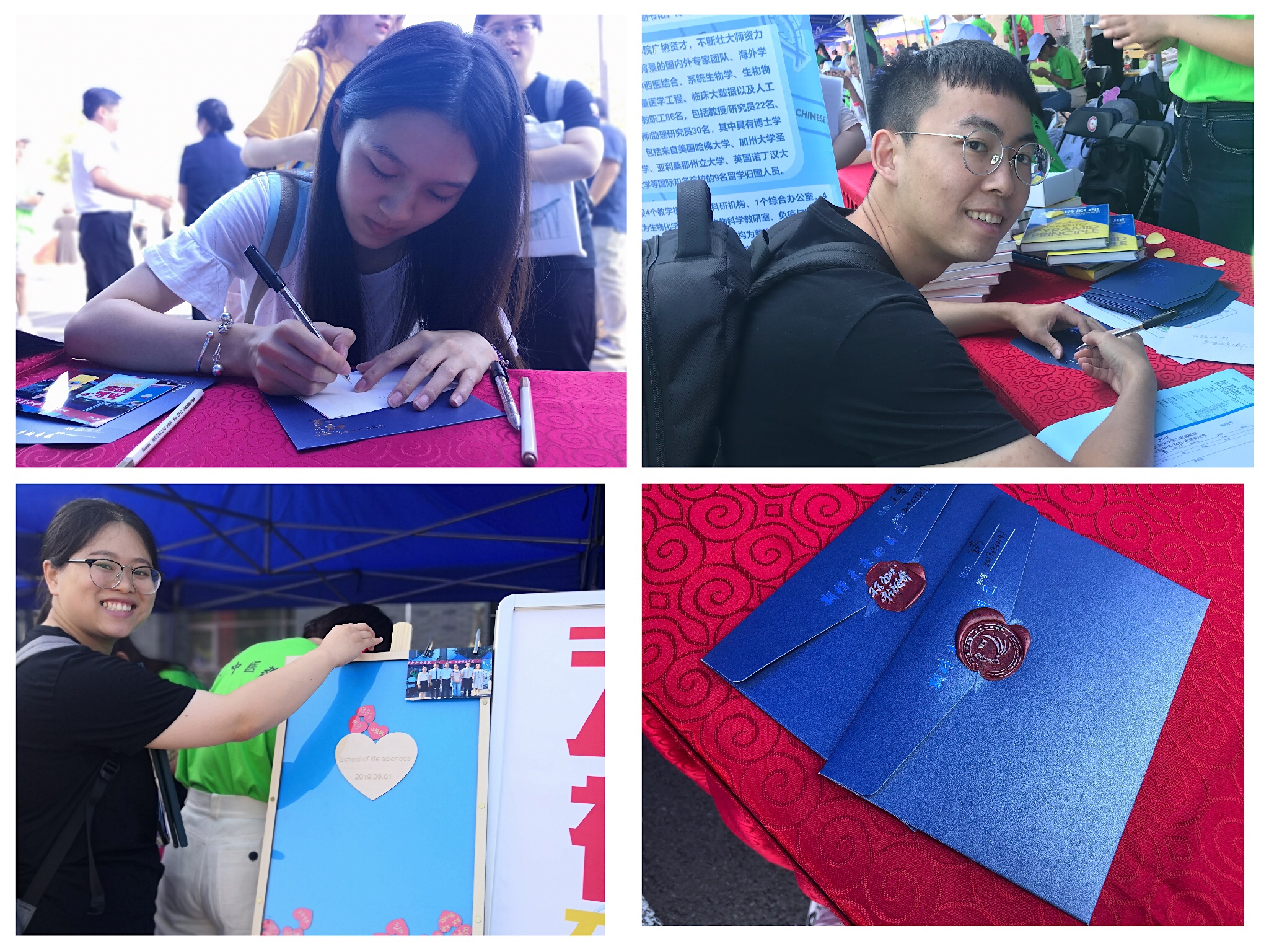 迎新现场,我们开展了院领导荐书活动,学院领导班子现场欢迎新同学,并从学术道德、创新发展、新时代视野等多个领域为新生推荐书目,启动学院新生读书交流活动,期冀同学们从入校起便能不断自我激励、开拓眼界、全面学习,并传承发展北中医精神,成为适应新时代发展需求的高层次中医药人才;辅导员们为新生精心设计了“爱心签到”及“书写初心,见证成长——寄给毕业时自己的一封信”活动,老师为同学们拍下照片,记录好正式成为北中医人的这难忘的一刻,同学们激动地在自己的照片背后写下对研究生阶段自我发展的目标及为自己的中医药梦想而努力的初心和决心,将照片装入信封,用带有“不忘初心”字样的火漆封印,再亲手投入生科未来邮箱,待毕业时,再由同学们亲手开启我们入校时写下的初心和希望,融入“我与北中医共成长,我与祖国共成长”的满满回忆,以激励自己再起航。