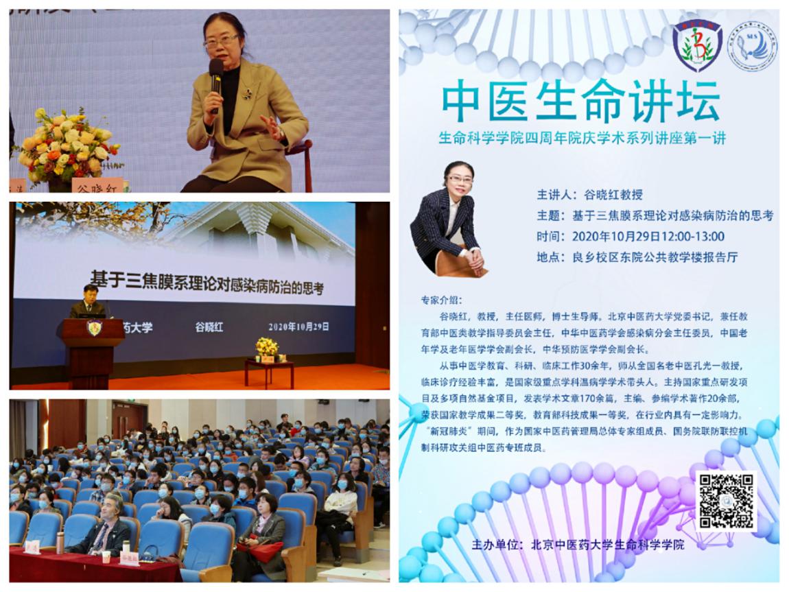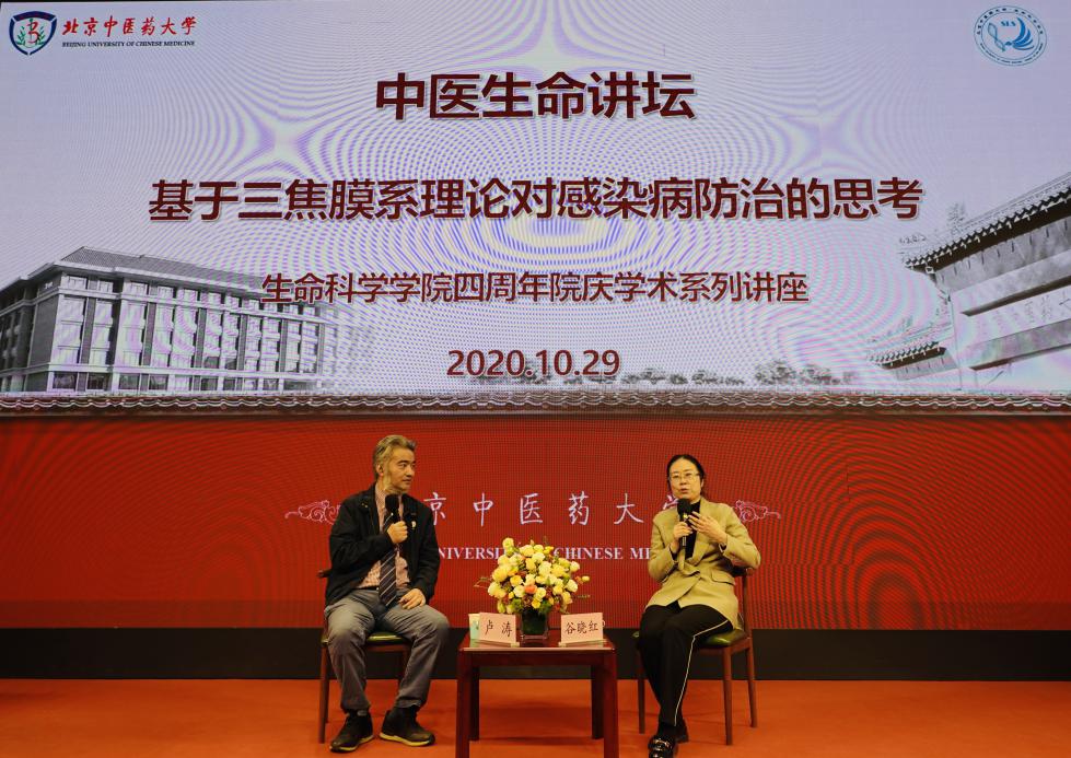 2020年10月29日,beat365在线唯一官网登录顺利举办了四周年院庆系列学术活动—中医生命讲坛,本次讲坛邀请我校党委书记谷晓红教授进行主题演讲,我院卢涛副院长作为对话嘉宾。讲坛全程围绕《基于三焦膜系理论对感染病防治的思考》进行了深度交流。学院党总支书记李天罡、副院长王建勋、陈幼楠及学院师生代表200余人参加活动,活动由王建勋副院长主持。