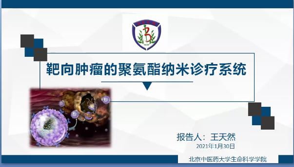 王天然老师作了题为《靶向肿瘤的聚氨酯纳米诊疗系统》的报告,首先在研究背景中简要介绍癌纳米生物技术、用于癌症治疗的纳米粒子EPR效应、主动靶向作用、克服生物障壁的策略。进而介绍了研究的总体设计,运用纳米载体作用抗肿瘤药物缓释环节,进而表面功能化靶向,最终实现成像诊断能力,主要在聚氨酯纳米粒子作为药物缓释载体(软段结构的作用)、表面功能化的纳米粒子载体、诊疗系统三个部分展开介绍。