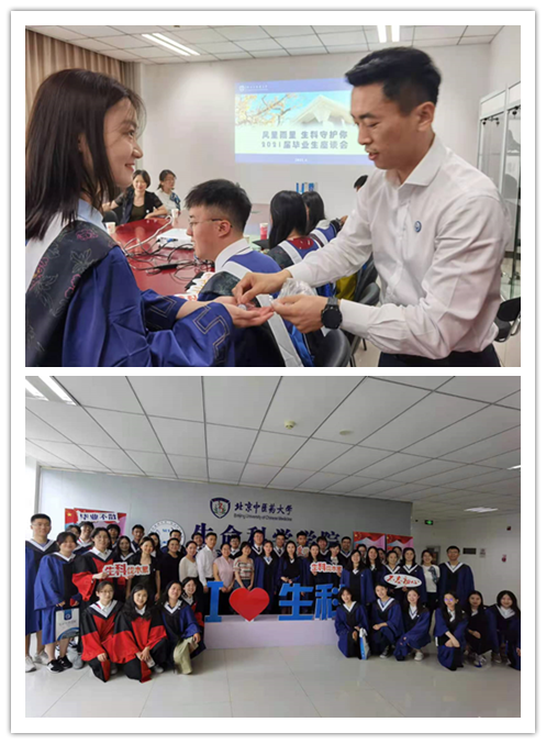 最后李天罡书记代表学院向同学们送出了一份特别的毕业礼物——生科雨伞、生科院徽,寓意“风里雨里 生科守护你”。同学们备受鼓舞,感谢学校、感谢学院对自己的培养和关爱,大家表示定将努力学习和工作,以报答学校和学院的培育之恩。座谈会师生一堂,在依依不舍、温馨祝福的氛围中圆满结束。祝福所有的生科学子,祝福所有的北中医学子,勇攀高峰,前程似锦!