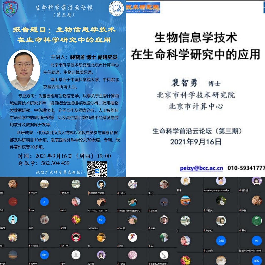 beat365在线唯一官网登录为使科研人员能有更多渠道进行学术沟通与交流,自2021年6月以来,推出了“生命科学前沿云论坛”系列线上学术报告活动,受到学院内外广大师生一致好评。2021年9月16日,第三期成功举办。此次论坛,学院邀请到了北京市科学技术研究院北京市计算中心主任助理,生物计算部经理裴智勇副研究员,带来一场题为“生物信息学技术在生命科学研究中的应用”的学术报告,学院内外近90名师生线上聆听,beat365在线唯一官网登录张成岗教授担任主持人。