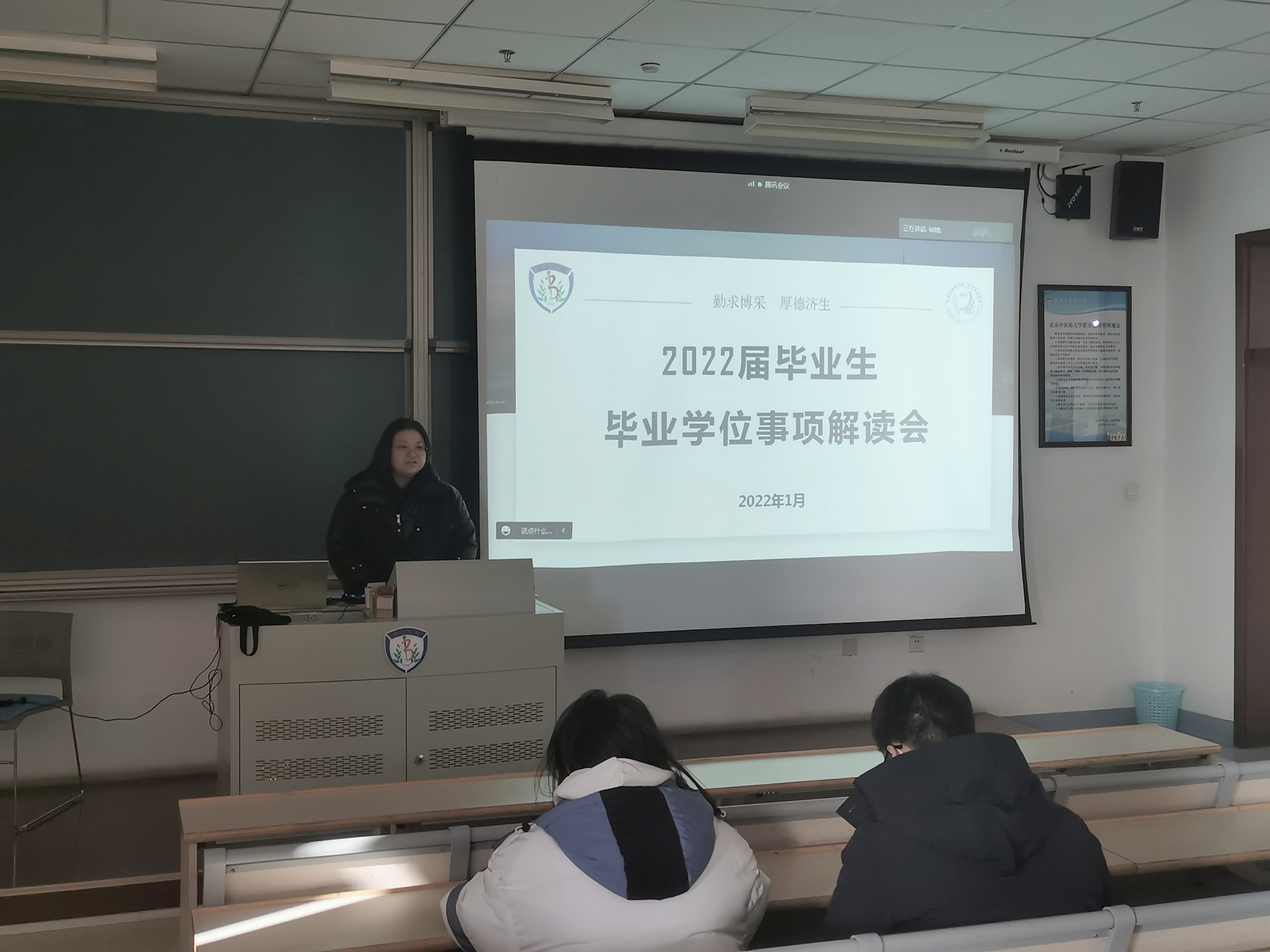 首先学院学位秘书钟嫱对学院工作方案及细则进行了宣讲,对今年的主要变化、每年学位工作中容易出现问题的细节、具体举措、时间节点,都一一准确说明,并要求同学们严格遵守国家要求和学校规章制度,做好疫情防控,与导师保持密切联系与沟通,尽一切努力提前准备、按时提交材料,将工作做到前面,与学院共同做好今年毕业与学位授予工作。