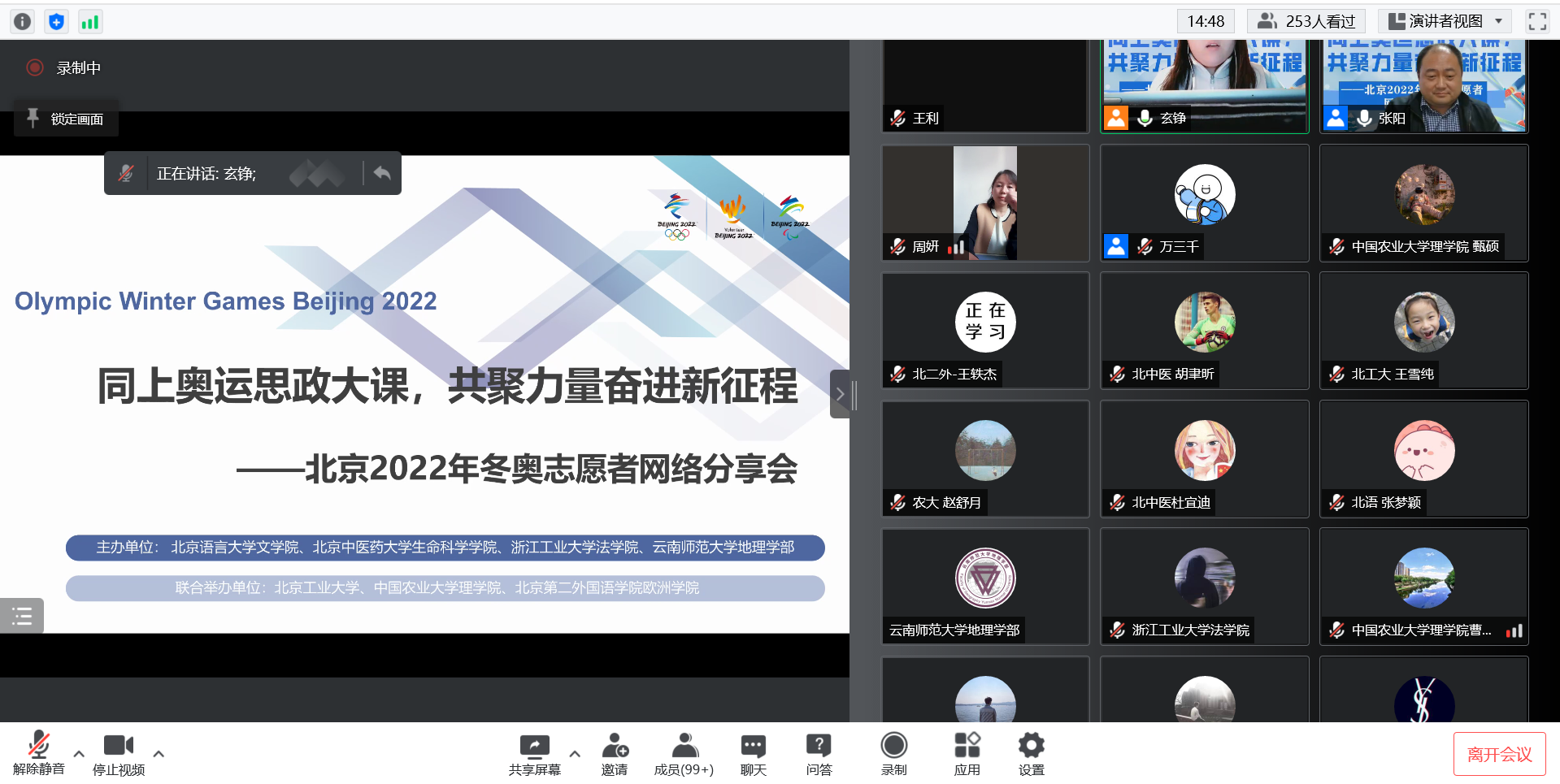 为充分发挥冬奥志愿服务优势资源作用,3月2日晚18:30,beat365在线唯一官网登录联合北京语言大学文学院、浙江工业大学法学院、云南师范大学地理学部、北京工业大学、中国农业大学理学院、北京第二外国语学院欧洲学院开展“同上奥运思政大课,共聚力量奋进新征程”北京冬奥志愿者网络分享会,来自各高校300余名学生以线上线下相结合的方式参加了此次网络分享会。