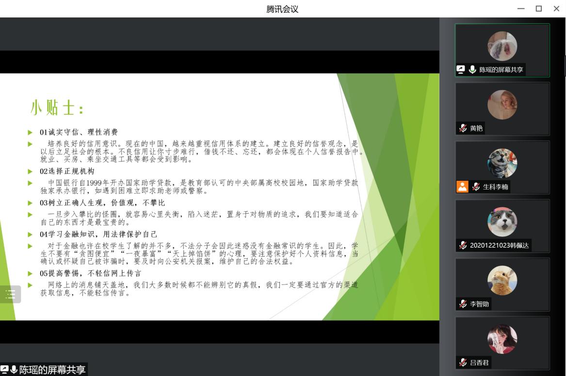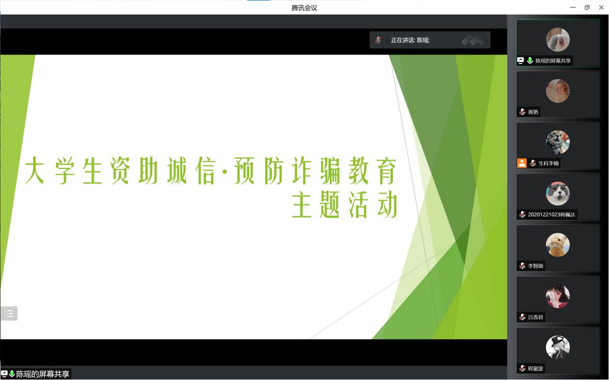 为进一步增强学生的诚信意识和责任意识,引导学生珍爱信用、理性消费、提高警惕、预防诈骗,beat365在线唯一官网登录于2022年6月17日下午4点,以腾讯会议的形式,在线上组织开展了资助诚信及预防诈骗主题教育活动。学院辅导员李楠老师、全体本科生、研究生代表全程参与了主题教育活动。活动由陈瑶同学主持。