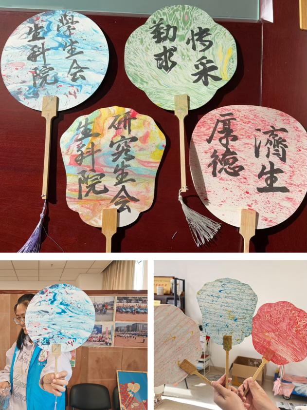活动现场洋溢着欢声笑语,师生们在轻松愉快的氛围中体验着“漆扇”带来的乐趣,期待着亲手创造的“不可预估之美”。在志愿者的细心指导下,大家将调配好的漆滴入清水盆中,用竹签轻轻挑动,漆的纹路随之变化。手持精心挑选的小扇,调整好角度后下水沉入、提转,一把色彩斑斓、图案精美的漂漆团扇便制作完成。每当一把漆扇制作完成,都会引起现场师生的阵阵赞叹。漆扇展示的画面,宛如一幅幅山水画,有的似晚霞落日,有的如碧波荡漾。从扇子的挑选,到漆液的调配、上漆,再到图案的设计与绘制,每一步都需参与者融入自己的思考,展现出每个人独特的创意与风格。师生们普遍反映,活动不仅让大家体会到了中医药文化的魅力,还能有效减压,充分展现了校园文化的活力。