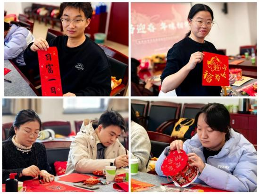 笔墨迎春,福满校园。师生们一同挥毫泼墨,一笔一画饱含新春祝愿,一纸一墨尽显传统年味。红彤彤的春联与福字错落铺开,将现场装点得喜庆热烈,欢声笑语不断。趣味猜谜环节更是精彩纷呈,同学们踊跃参与、积极互动,青春的笑脸与浓浓的年味相映成趣,处处洋溢着祥和、热烈、向上的氛围。
